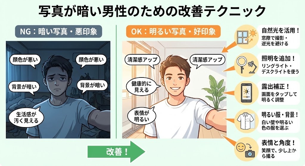 「なぜかマッチングしない…」その原因、プロフィール写真の「暗さ」かもしれません。清潔感が劇的にアップする撮影環境の作り方や、簡単な加工テクニックを紹介します。
